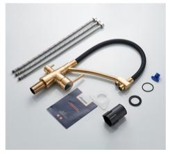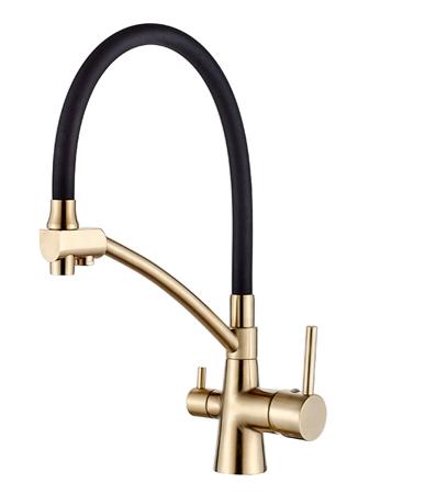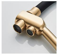 Enhance your kitchen with this Purification Sink Mixer Tap A5179AW, featuring a black swivel spout and an extra inlet for drinking water. Crafted from premium brass with a gold-plated finish, it ensures durability, smooth water flow, and long-lasting performance. Perfect for modern kitchens in the UAE, this tap combines elegant design with functionality, providing safe purified water for daily use.